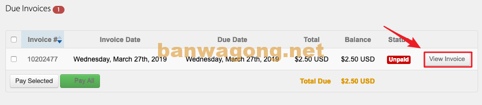 就可以看到下面的未付款账单,点击 “View Invoice”,就可以查看这个未付款的充值账单。