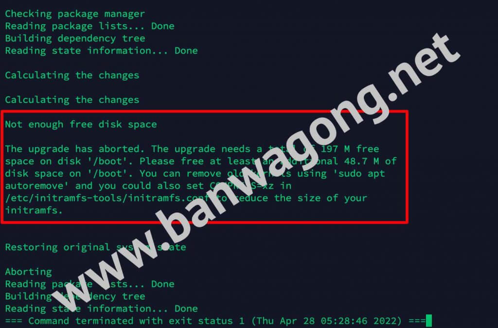 因为这几天 Ubuntu 22.04 正式发布了(搬瓦工 KiwiVM 后台重装系统新增支持 Ubuntu 22.04 LTS 系统),搬瓦工也第一时间在 KiwiVM 后台支持了 Ubuntu 22.04 的安装。搬瓦工中文网手头有一台闲置的 DC9 CN2 GIA 限量版 VPS,安装的是 Ubuntu 20.04 重装系统,于是想着拿来升级一下体验一下升级操作。但是发现在 Ubuntu 20.04 升级到 Ubuntu 22.04 的过程中,由于搬瓦工 /boot 分区的设置,导致并没能成功完成升级。暂时也不知道怎么解决,就先记录一下。