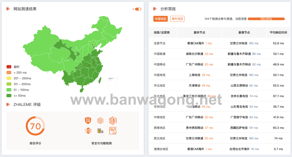 下面是搬瓦工香港 HK85 机房延迟测试结果,从测试结果来看,三网延迟都很低,都是平均在 50ms 左右,最低的都是在 20 多毫秒。