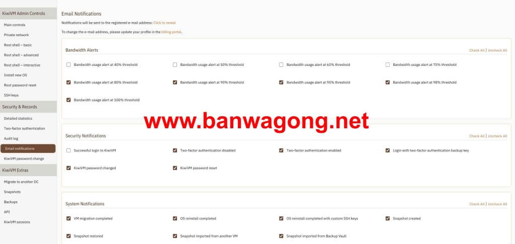 如下图所示,我们点击 KiwiVM 控制面板的左侧菜单栏中的 Email notifications,就可以看到自定义邮件通知的页面。在这里可以勾选一些邮件通知选项。