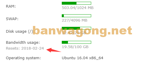 有些朋友可能一不小心流量用完了,很关心什么时候恢复。一般我们购买的VPS都是采用流量计费的。国内的主要都是固定带宽,然后不限流量(但是流量多了,还是会限速)。但是国外的VPS,包括搬瓦工,采用的都是根据流量计费的,也就是一个月固定多少流量,如果流量用完,那么这个月就暂时没法用了。